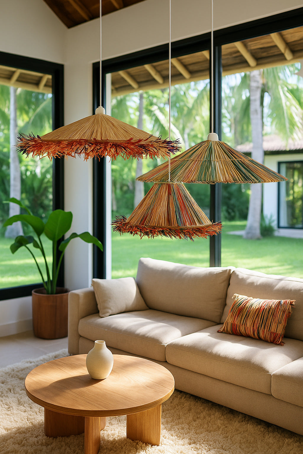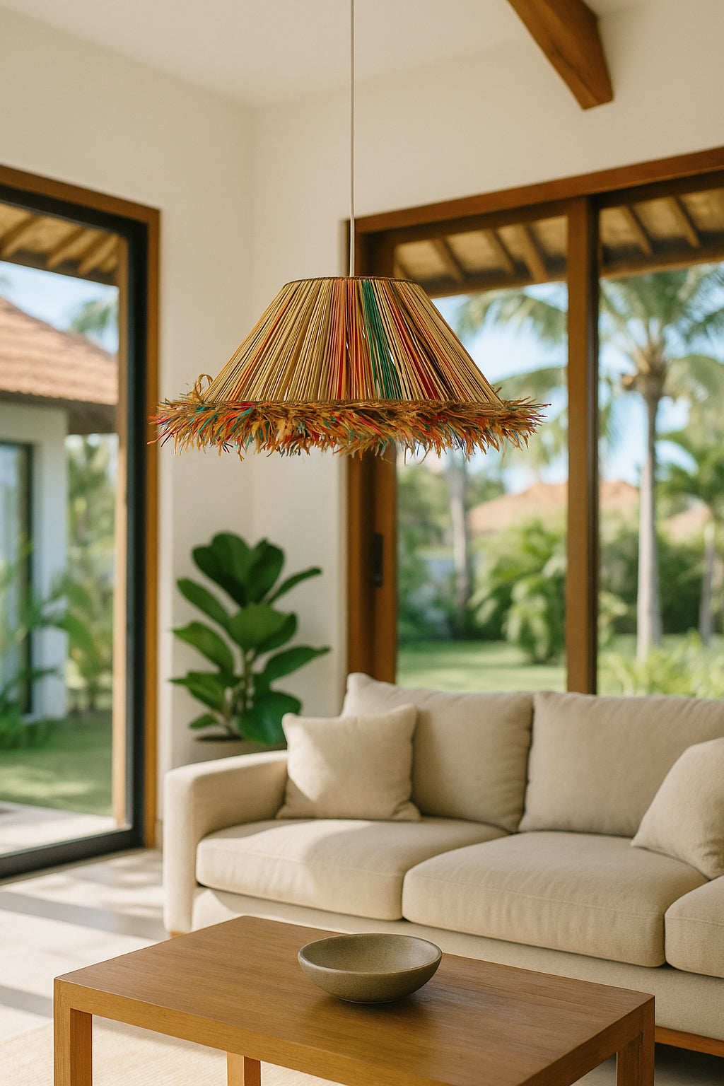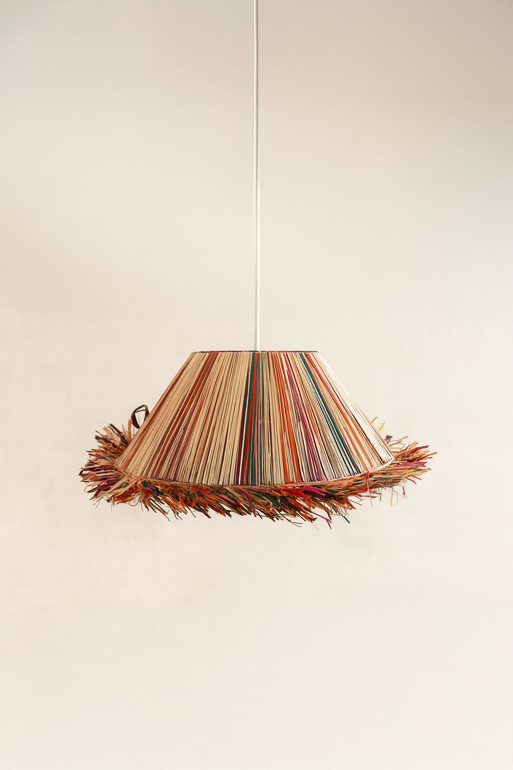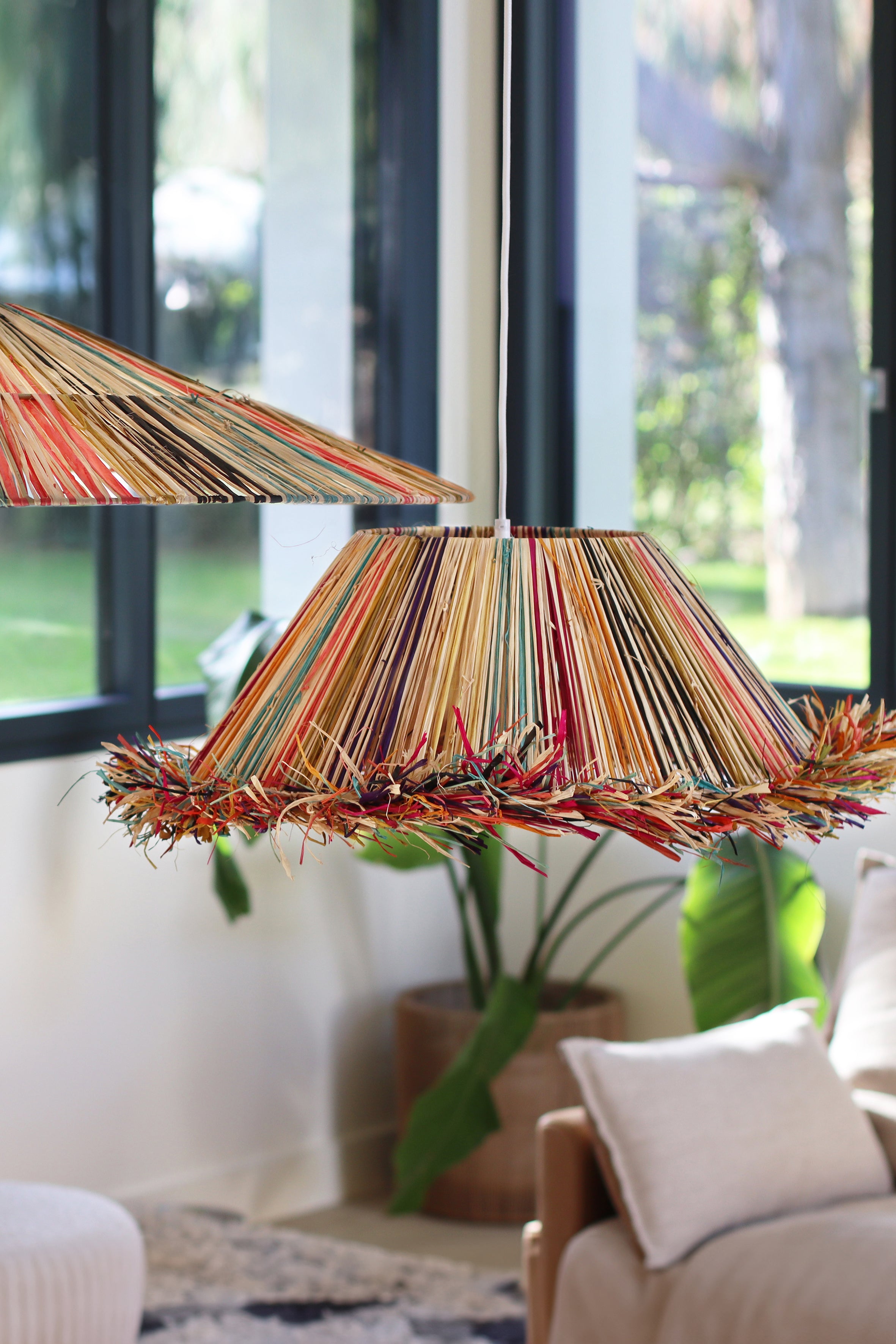 La suspension évasée JOLO en raphia naturel multicolore est une pièce exceptionnelle qui allie la beauté naturelle du raphia à l'élégance des couleurs chatoyantes. Avec un diamètre de 60 cm, elle devient rapidement la pièce maîtresse de votre décoration intérieure. apportant chaleur, style et une touche d'originalité à votre espace. Les couleurs vives et variées du raphia créent une ambiance chaleureuse et accueillante, égayant instantanément n'importe quelle pièce.