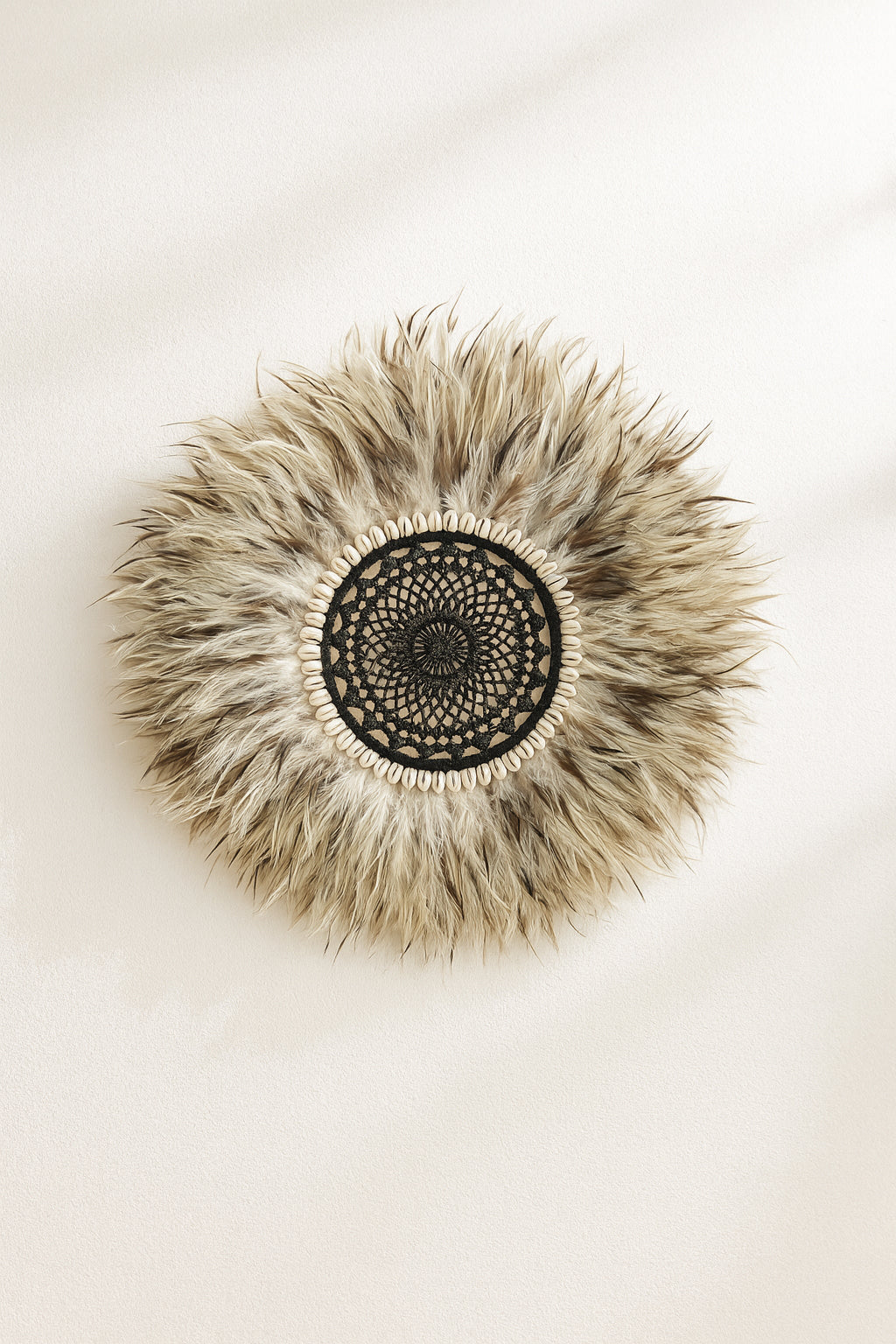 Matière: Plumes de coq et coquillages. Fil de coton noir.