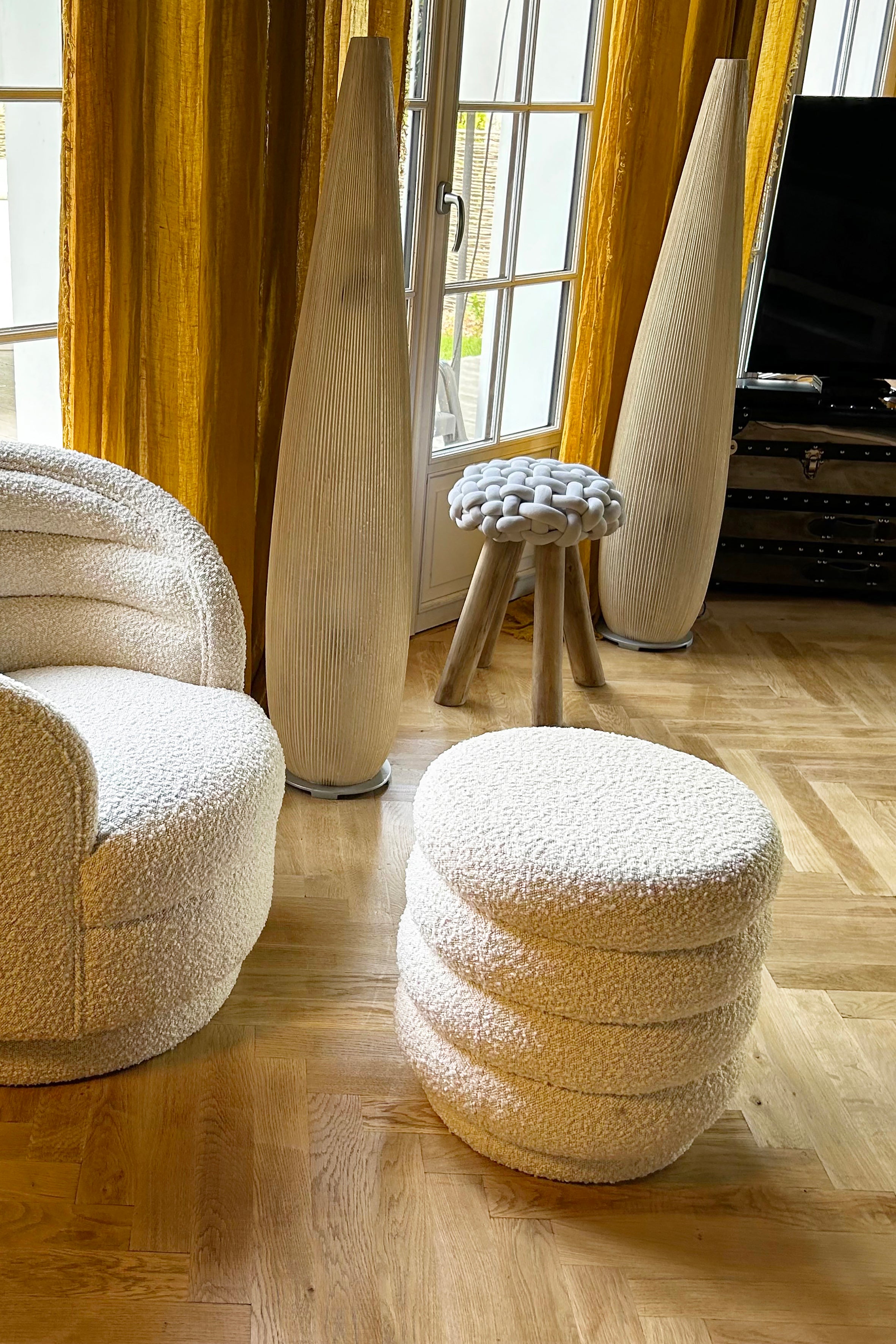 Le tissu bouclette beige envahit petit à petit nos intérieurs. Grace à ce pouf LINUS, aux lignes arrondies, vous pourrez créer une ambiance chaleureuse et cocooning dans la pièce de votre choix.