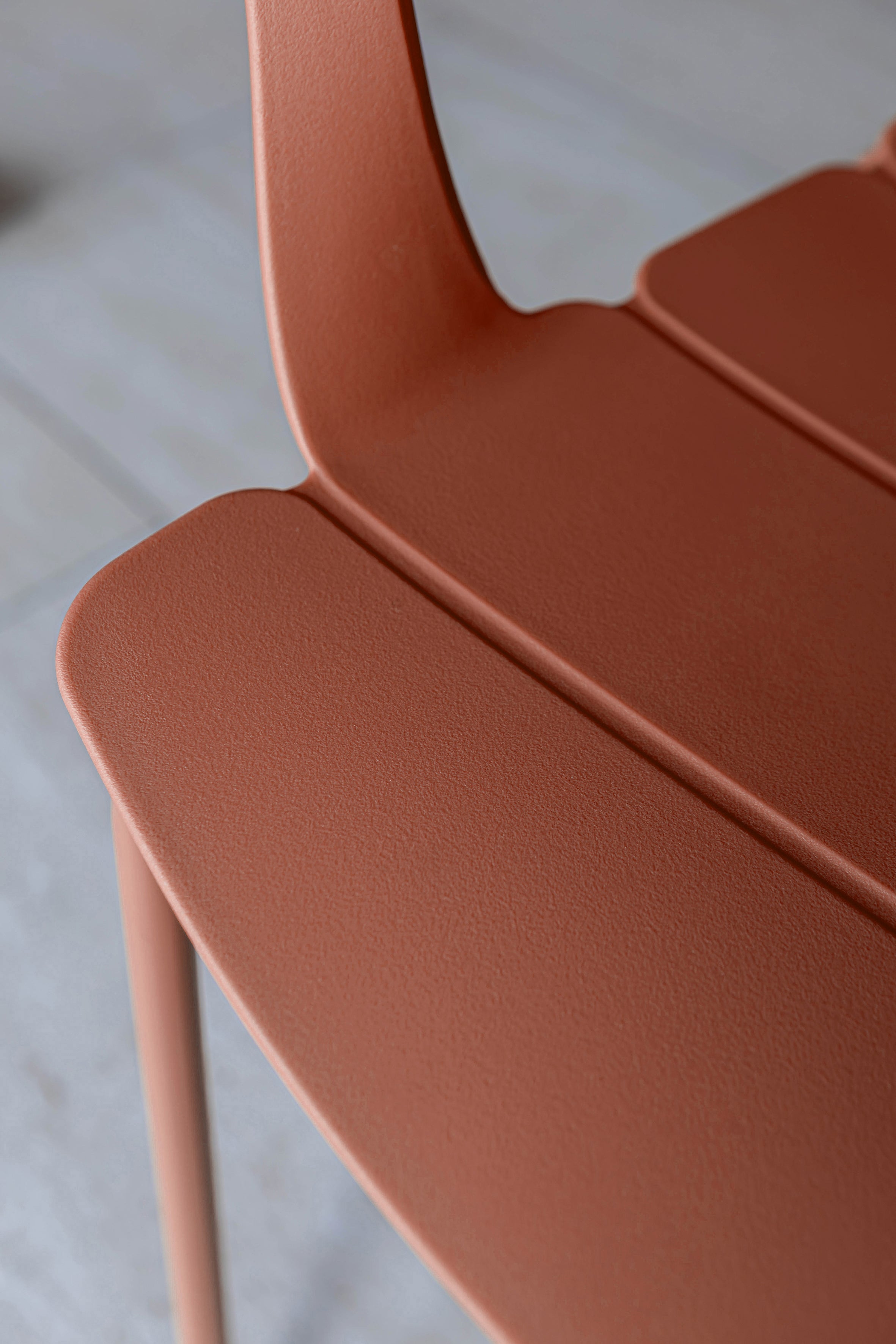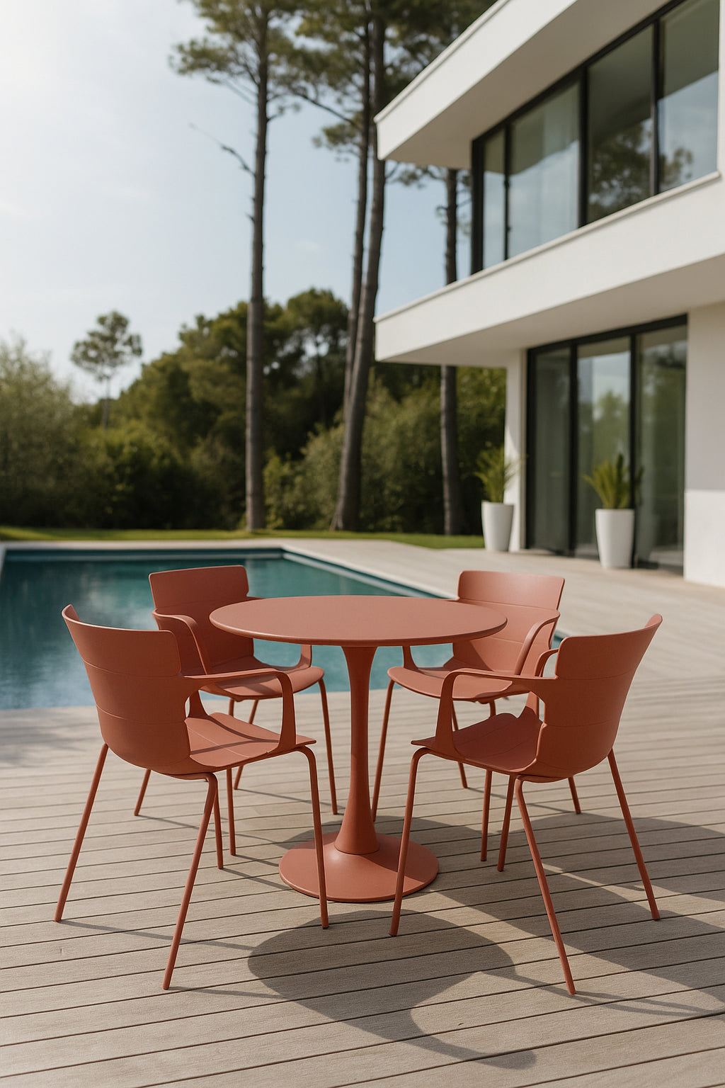 Cet ensemble de mobilier moderne réunit une petite table ronde de 80 cm de diamètre avec un pied central en métal brique et quatre fauteuils de table assorties, également en polypropylène brique avec pieds en métal. Il s’agit d’une solution idéale pour ceux qui souhaitent aménager un espace à la fois tendance et reste parfait pour transformer vos espaces extérieurs en un lieu à la fois fonctionnel et stylé.